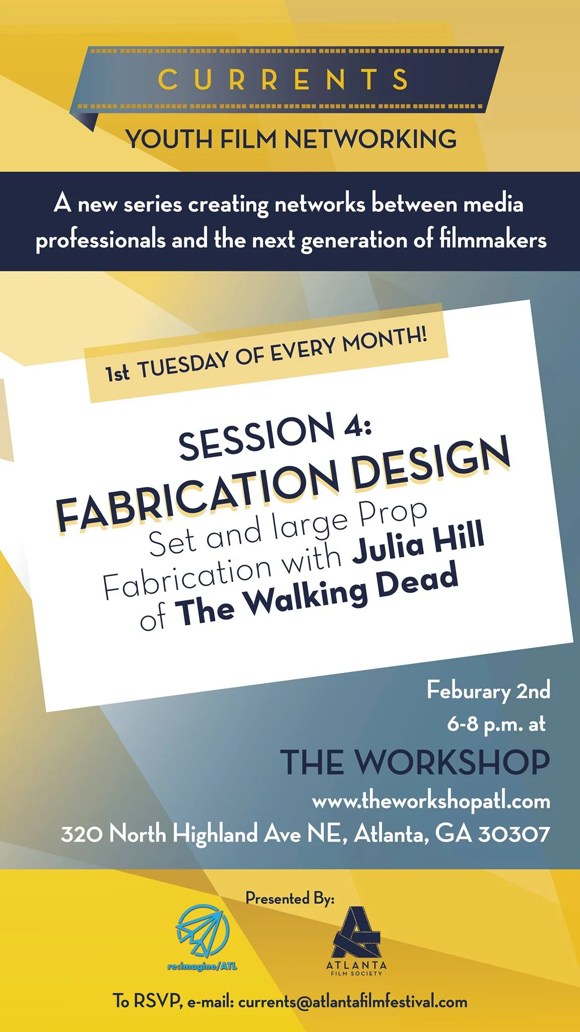Join the Atlanta Film Society and re:imagine/ATL on February 2nd for Currents' fourth session. This month is on set design and fabrication, hosted by Julia Hill from "The Walking Dead." Julia will talk about her beginnings in the business, including her set work for "The Hunger Games." Attendees will be given the opportunity to gain hands on experience with prop building.